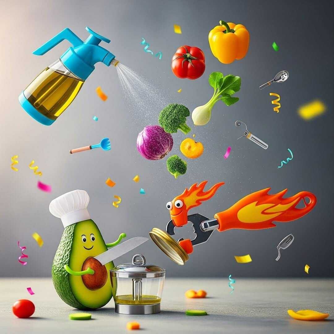 A whimsical avocado chef, oil sprayer, and superhero jar opener in a chaotic kitchen.
